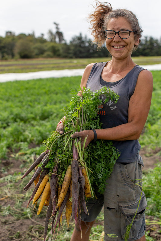 Farmer, fixer of all things broken, co-founder Logan, who is rarely anywhere without his radio earmuffs, is one of the veteran vegetable farmers in our midst. He manages a number...